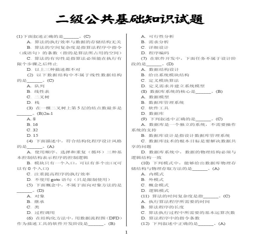 全国计算机二级考试公共基础知识题库及答案资料下载,喜欢的朋友可以下载收藏!