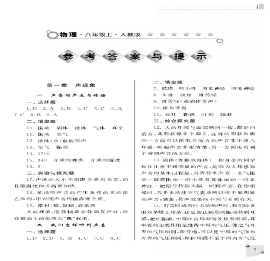 人教配套练习册物理人教八年级上答案资料下载,喜欢的朋友可以下载收藏!