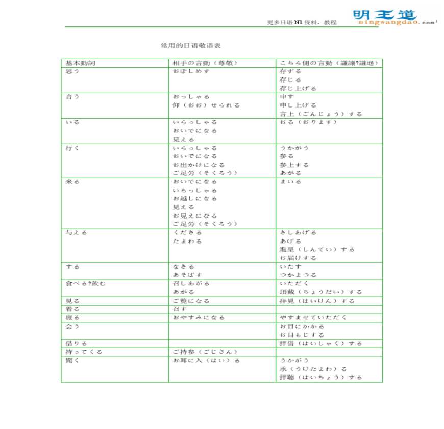 日语N1考试常用的日语敬语表完资料下载,喜欢的朋友可以下载收藏!