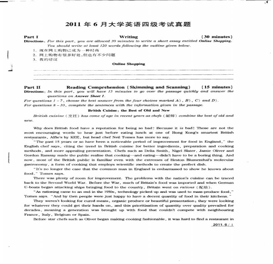 2015年6月英语四级真题及答案(第一套)