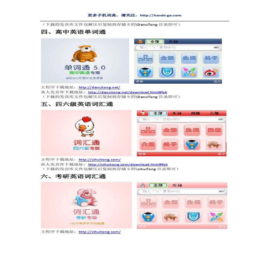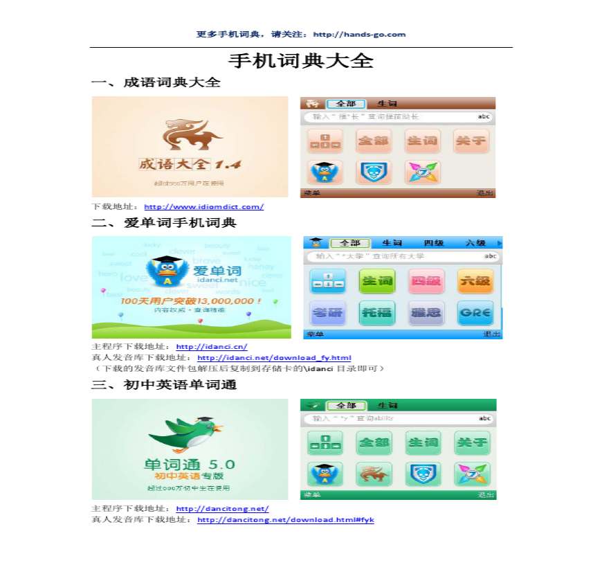 【专题】 个 手机词典哪个好用以及手机词典软件哪个好是很多朋友在问的,现在的我们不再过多的依赖纸张的词典,而是可以通过手机下载一些词典,直接使用查询,这金山词霸爱词霸英语为广大英语学习爱好者提供金山词霸、在线、在线翻译、英语学习资料、英语歌曲、英语真题在线测试、汉语查词等服务金山词霸资讯站产品 版权:软件大小: MB语言:简体中文简介:易有道支持中文、英语、日语、韩语、法语 点击下载 有道手机词典下载