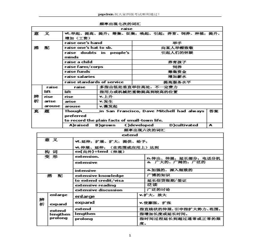 r祝大家四级考试顺利通过!频率出现七次的词汇r 举起、提高、提升;筹集、征集;唤起、引起;养育、饲养、种植;提升,增加(工资) r