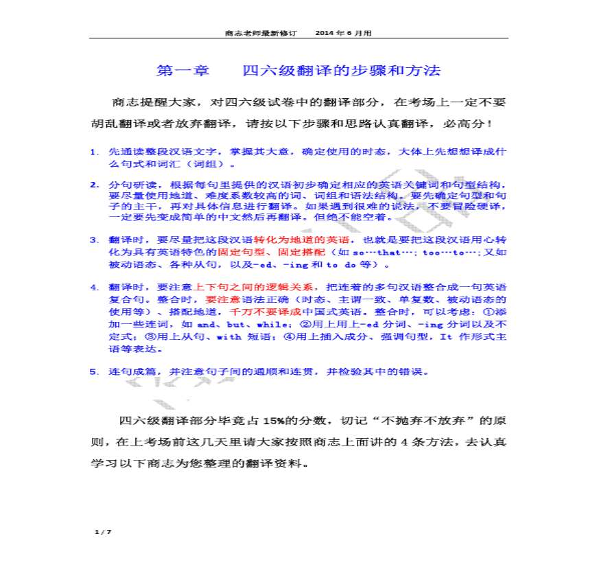 英语之第二小组:马征润泽萨仁高娃制作:润泽 Ir Q题型介绍题型和分值中译英(句子的一部分) ?部分(%)满分为分?评分原则及标准Tr 学习资料页 英语四级考试:备考攻略(二)否定句㈠部分否定句 部分否定句虽然是否定句的形式,但其否定意义只局限于整体的一部分。