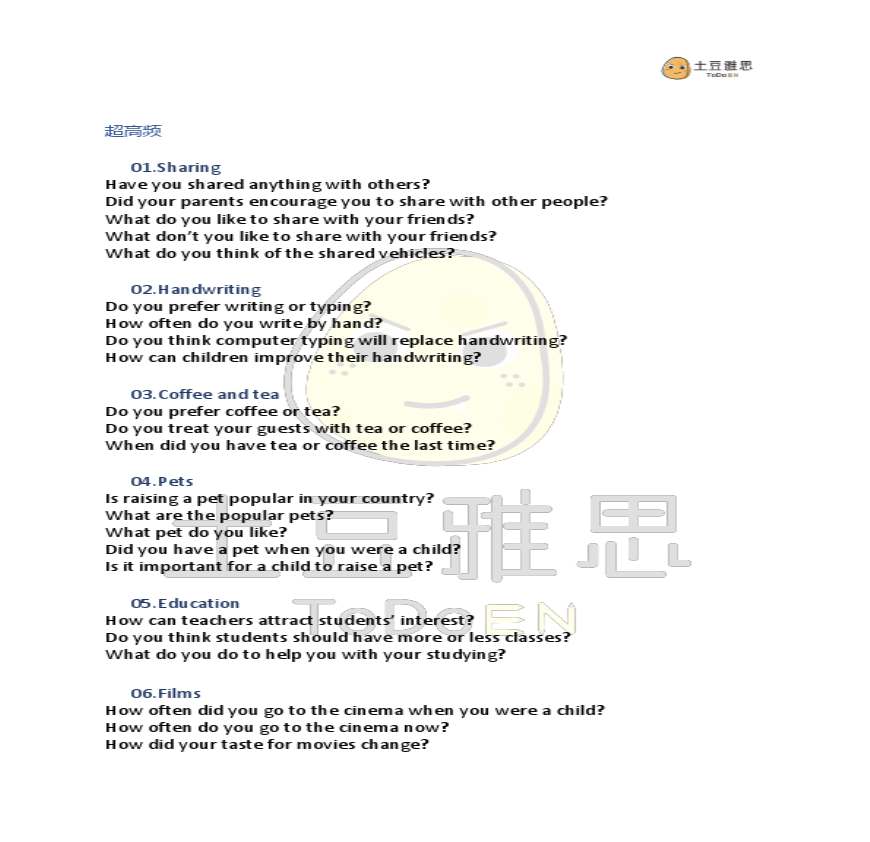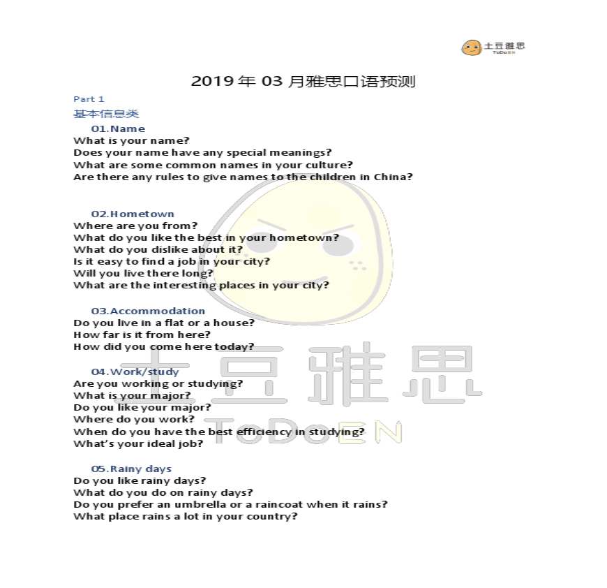 土豆雅思-3月口语预测资料下载,喜欢的朋友可以下载收藏!