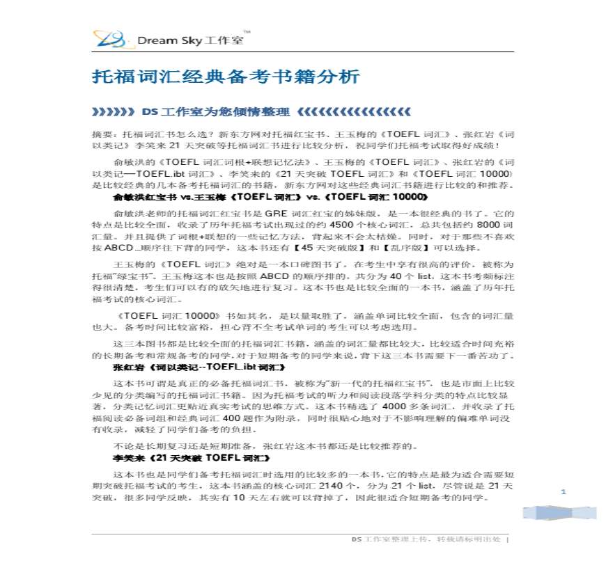 》》》DS 》》 DS工作室为您倾情整理《摘要:托福词汇书怎么选?新东方对托福红宝书、王玉梅的《TOEFL词汇》、张红岩《词以类记》李推荐:书的选择过程中资料的选择是一个重点,这其中针对的词汇书选择又是 《词根+联想记忆法》,俗称“红宝书”,这是