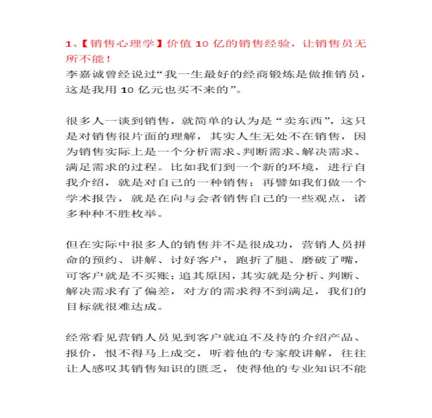 【销售心理学】价值10亿的销售经验,让销售员无所不能!资料下载,喜欢的朋友可以下载收藏!
