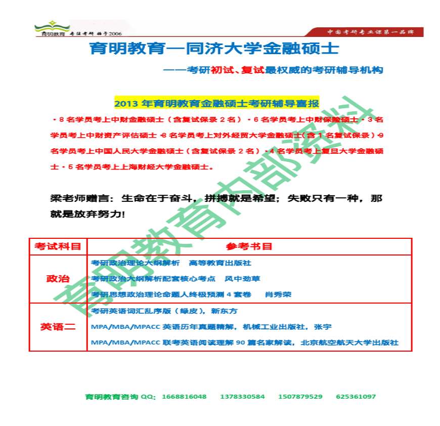 育明教育:2014年同济金融专业硕士考研参考书目,考研真题,复试分数线,招生人数资料下载,喜欢的朋友可以下载收藏!