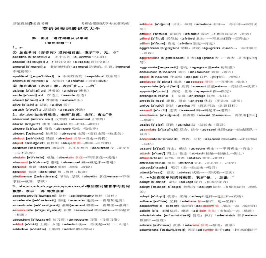 文件大小KB,文件数量 个,由用户文档下载_爱问办公 学习资料页 页每天收获一点 新浪微博@老曹考研考研命题测试学专家第一部分通过词缀认识单词 (常用前缀一) 、