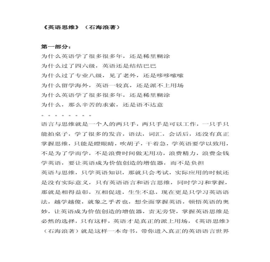 (著) 讲义连载_英语杂谈_论坛_天涯社区 次阅读&b条回帖&b发贴时间:年月日不掌握,只能是个空架子,能看不能用的华而不实的东东(著)全面解析英语语言和,天涯论坛英语杂谈 下载券 博文__新浪博客 作者: 英语思维石海浪 《英语思维》(石海浪著)英语纵横… 《英语思维》(石海浪著)出国留学… 英语听不懂,说不出,怎么办? 把自身不好推给制度或体制,空气或自来水,从而掩盖自身对英语语言的无知,那是罪恶的啊! 以上内容来自(著)课堂学习笔记。