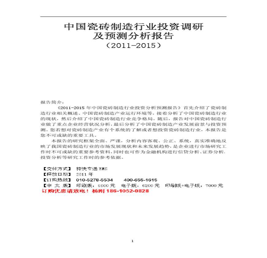 中国瓷砖制造行业投资调研及预测分析报告资料下载,喜欢的朋友可以下载收藏!