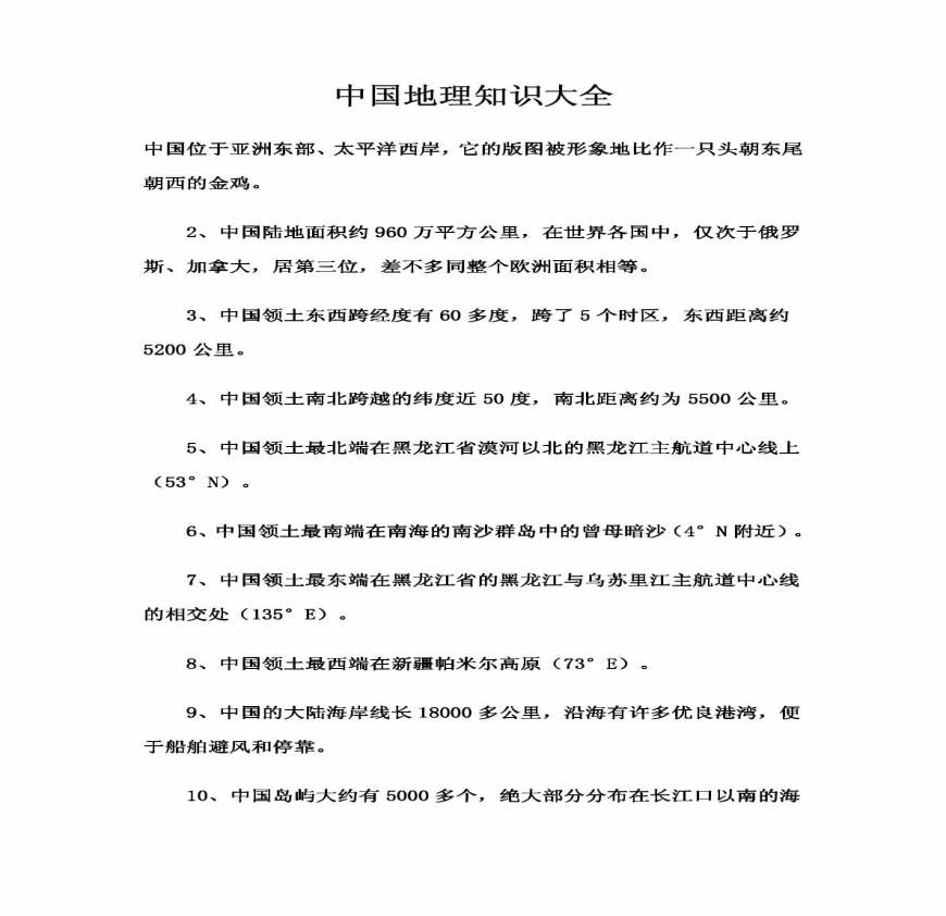 格式:全部DOCPDF质量分_中国地理知识中国地理知识 中国地理知识 中国位于亚洲东部太平洋西岸,它的版图被形象地比作一只头朝东尾朝西的金鸡,地势西高东低 中国陆地面积约万平方公里,在世界各国中,仅次于俄罗斯加拿大,居第三位,差不多同整个 共页[]共页[]共页共页 质量分、位于亚洲东部、太平洋西岸,它的版图被形象地比作一只头朝东尾朝西的金鸡。