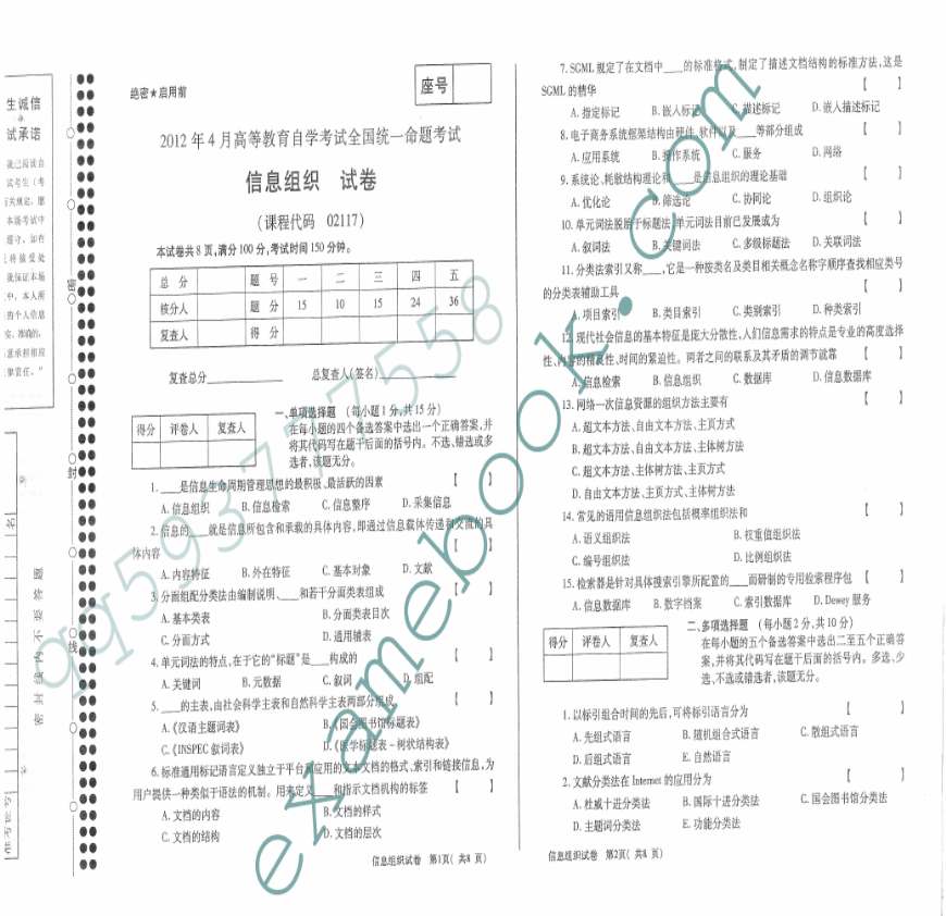 数量:道 次数:请先登录 练习次数:次 收藏试 、单科题库权限:不限次数使用《信息组织》的题库(搜题:赠送此科目) 期限: 学习资料页 第一章 一的含义 ,即信息序化或信息整序,也就是利用一定的科学规则和方法,通过对外在特征和内容特征的表征和序化,实现无序信息流向有序 多多文库 学习资料页 C 通卡 绝密启用前年月江苏省 课程代码注意事项 : 本分为两部分, 第一部分为选择题, 第二部分为非选择题
