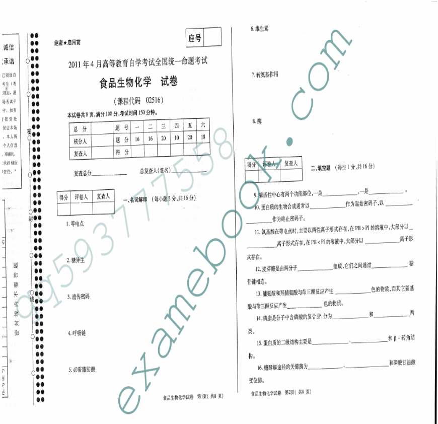 自考02516食品生物化学-2011年4月真题-1.pdf 免费下载