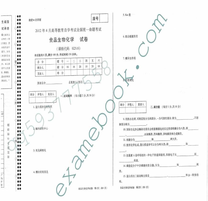 自考02516食品生物化学-2012年4月真题-1资料下载,喜欢的朋友可以下载收藏!