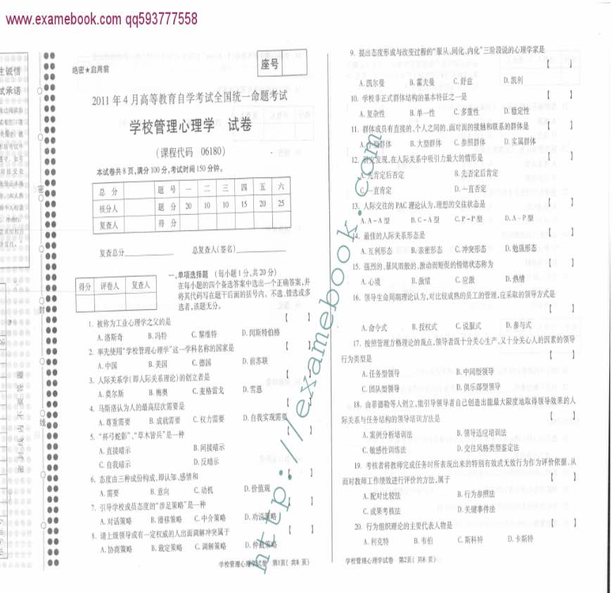 自考06180学校管理心理学-2011年4月真题-1资料下载,喜欢的朋友可以下载收藏!
