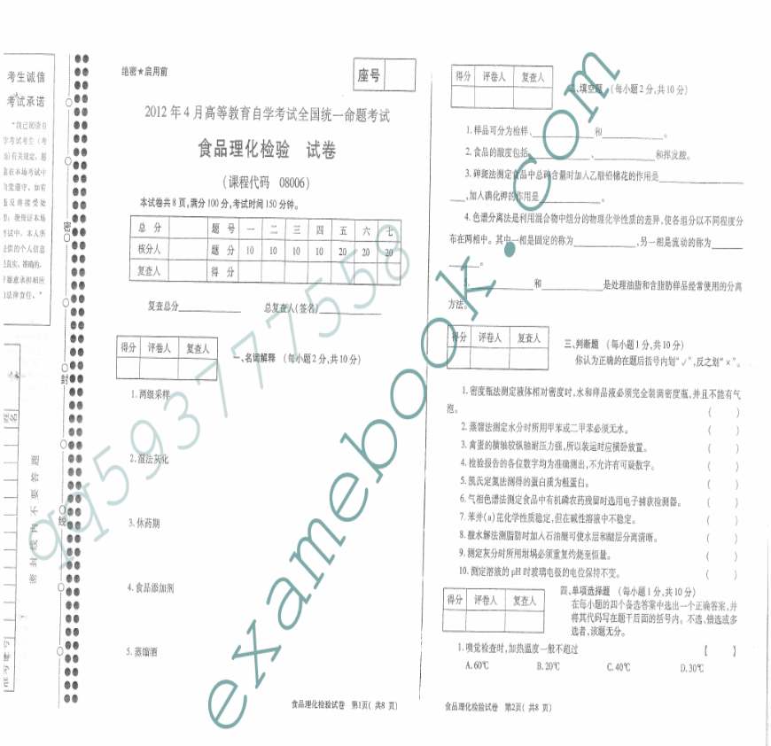 自考08006食品理化检验-2012年4月真题-1.pdf 免费下载