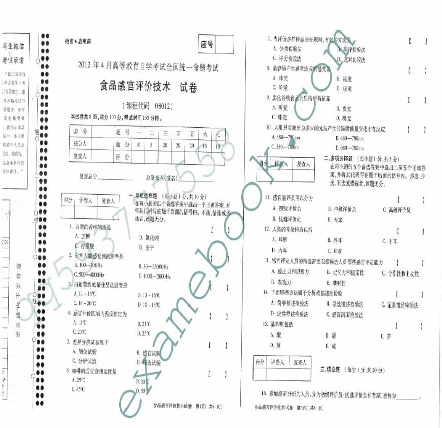 自考08012食品感官评价技术-2012年4月真题-1.pdf 免费下载