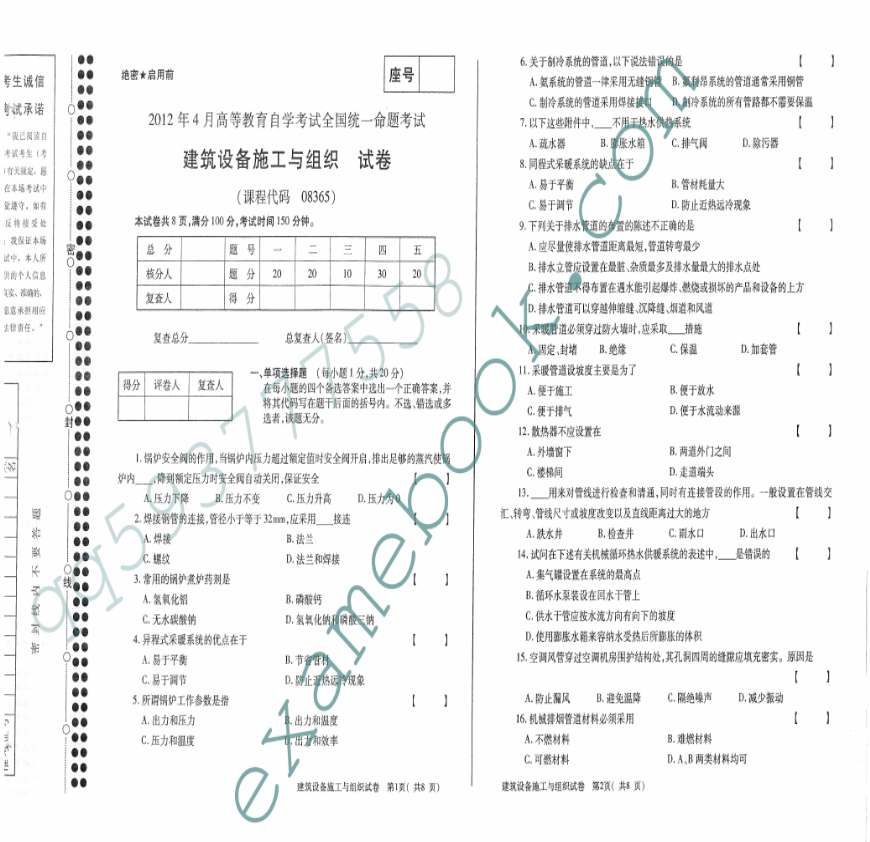 自考08365建筑设备施工与组织-2012年4月真题-1.pdf 免费下载
