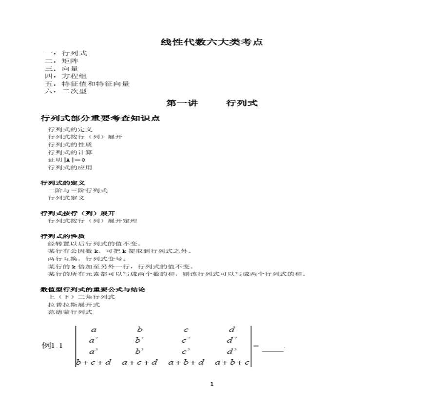 、线性代数六大类考点一:行列式二:矩 学习资料页 线性代数六大类考点一行列式二矩阵三向量四方程组五特征值和特征向量六二次型第一讲行列式行列式部分重要考查知识点行列式的定义行列式