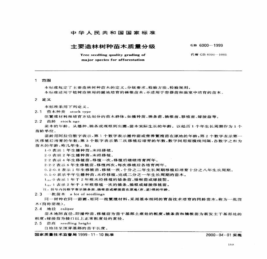 > 《主要造林树种苗木质量分级》(GB600—1999)